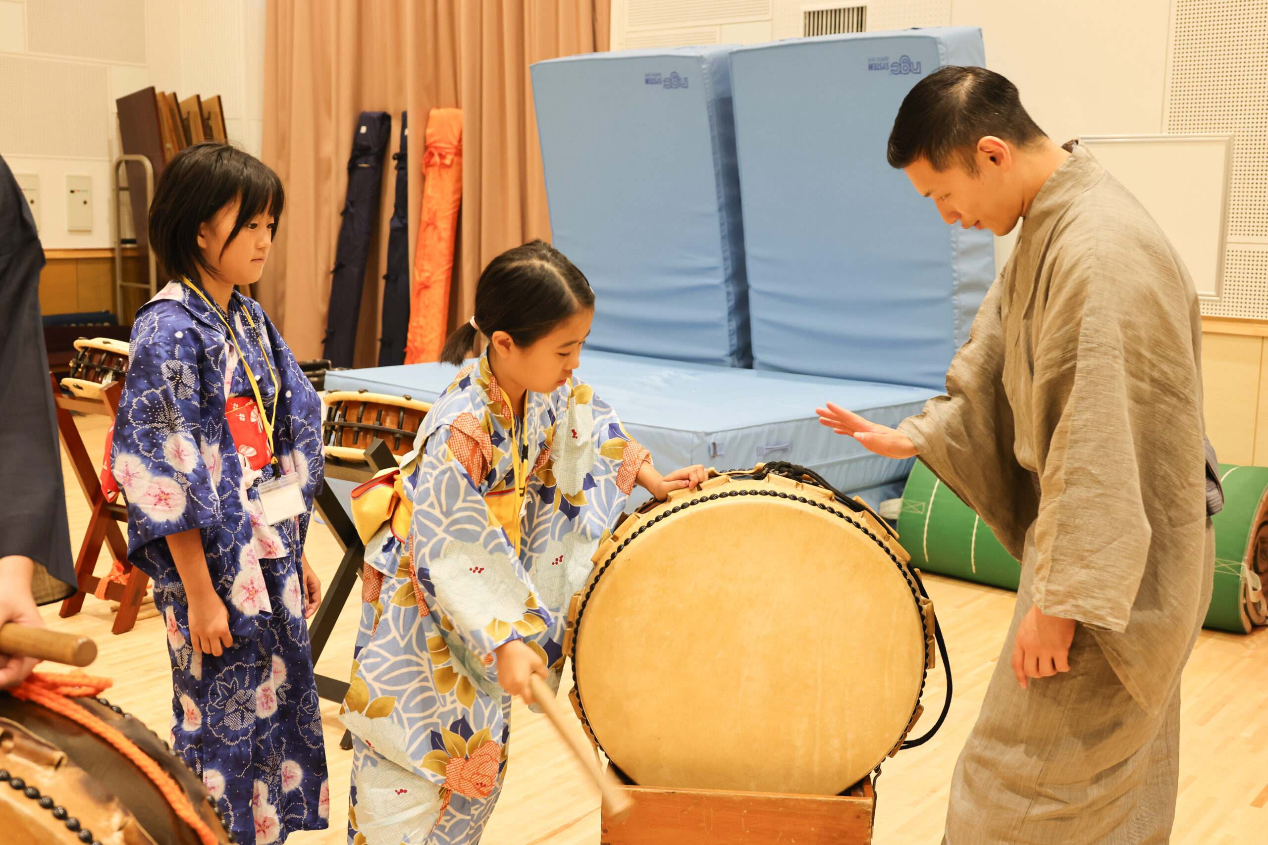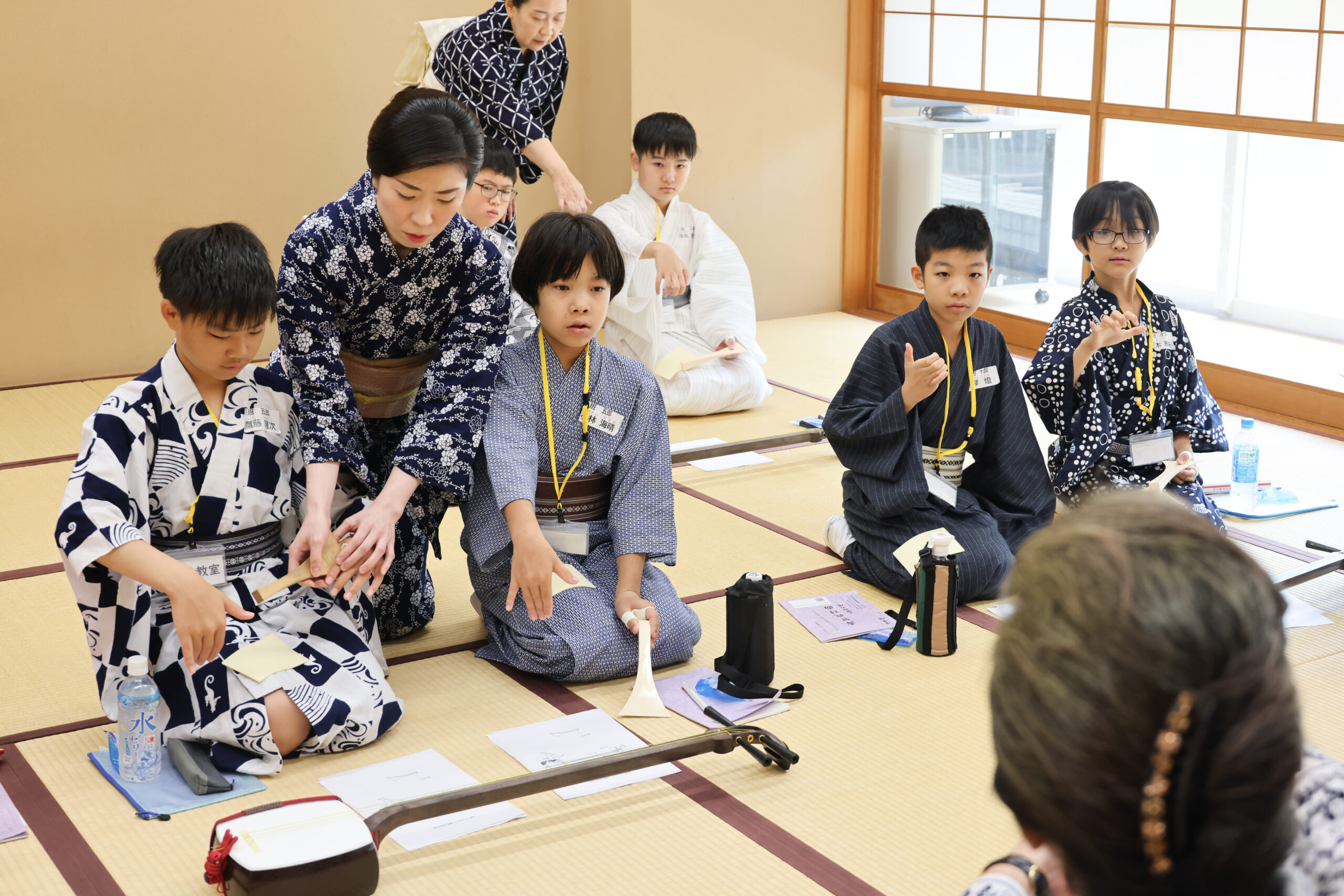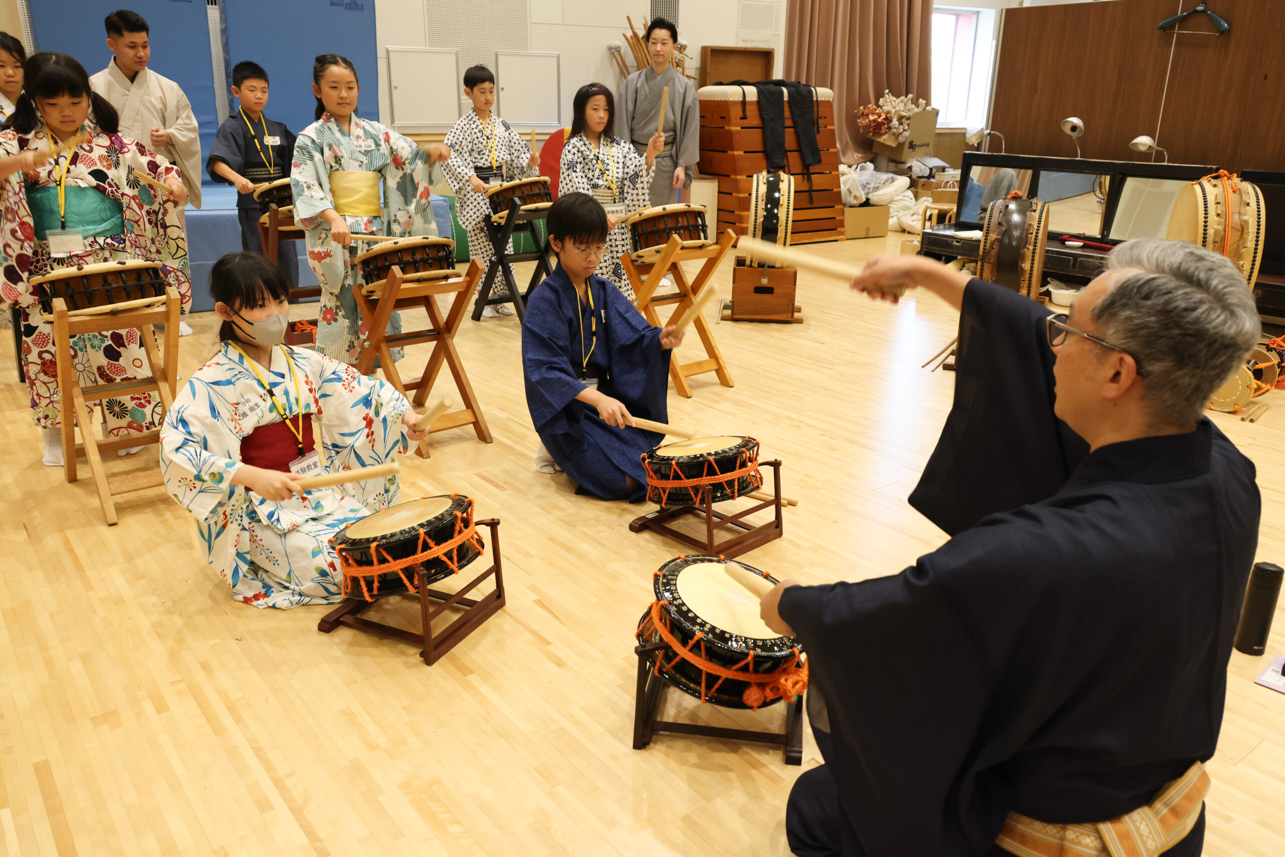 六年生は、鳥羽屋里夕さんと女流長唄の皆さんから長唄の細棹三味線のひきかたを教わりました。二人一組で交代に三味線のかまえ方、撥の持ち方などを教わり、最後には「蛍こい」という短い曲を弾けるようになりました。四年生と五年生は、別室にて田中傳次郎さんと歌舞伎囃子協会の方々から、歌舞伎で演奏される鳴物の楽器お話を聞き、実際に、太鼓や鼓の演奏体験をしました。児童たちは、時間が足りないほど熱中していました。