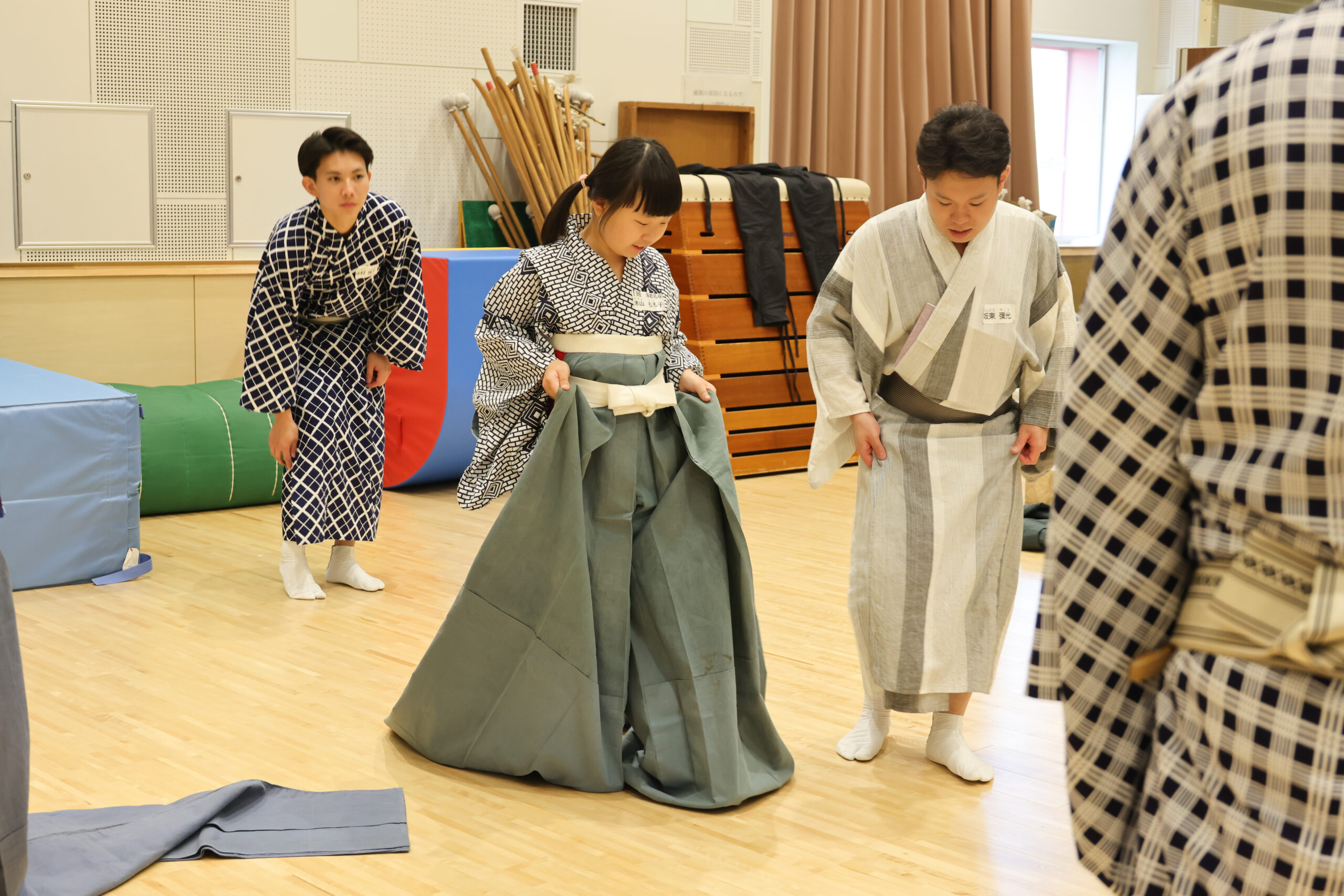 『寿曾我対面』のお稽古では、小道具を実際に使い、長袴を着用して歩く練習などを行いました。